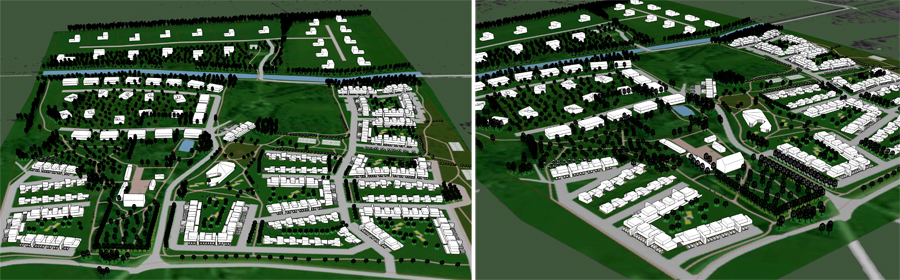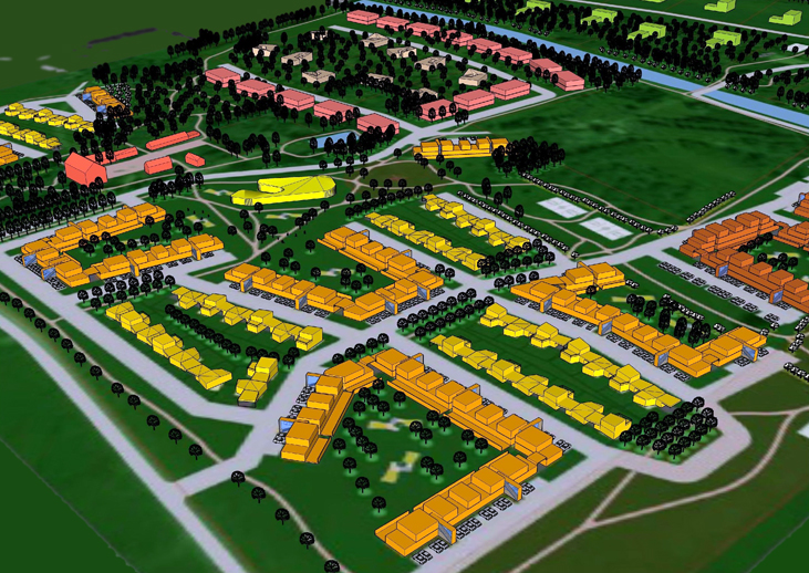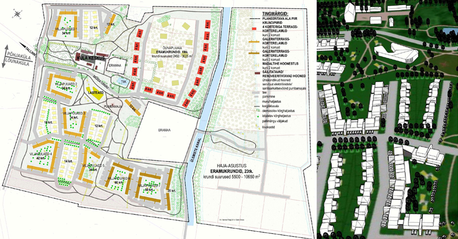 A natural, energy- and water saving `sustainable` neighbourhood for 500 families, on 2 sides of the Ülemiste canal, mostly on fields. A sympatheitc environment is created by carefully zoning dwellings into separate groupings around shared green areas, combined with a low scale (mostly 1and 2 storey, up to 3) approach. Feeling of place: Every place which has a special characteristic, whether natural, historic or otherwise unique (i.e. the manor houses, `cult stones`, pond, canal, landsape, the old orchards) is respectfully brought forth. 8 building types: 1)dispersed detached homes. 2)`Apple Orchard` detached homes, properties 2490-3025m². 3)Terrace-apartments with 4 units. 4+5)Gallery/Terrace apartments, til 2 storeys, til 3 storeys. 6)Low-density rowhouses. 7)Restoration homes (``Village Centre``). 8) Kindergarten. L.Tork, M. Soonets.
